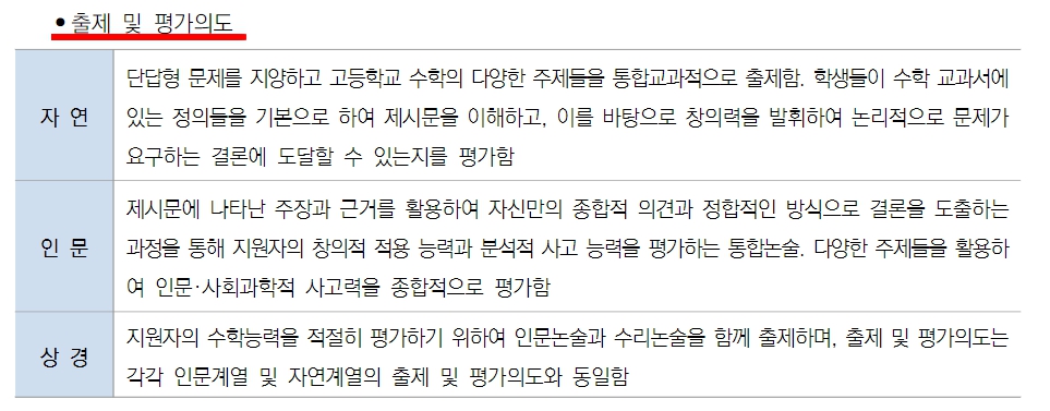 논술 전형의 출제 문항 수 및 출제 범위 입니다.